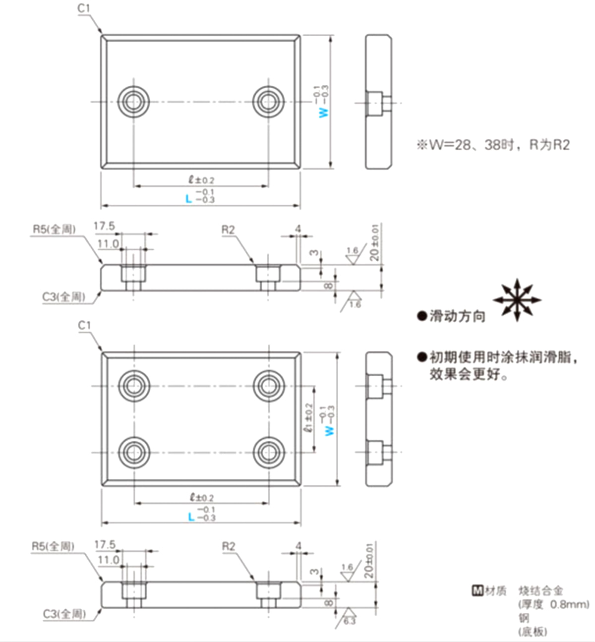 Tấm trượt lưỡng kim với hợp kim chịu mài mòn được thiêu kết trên ba mặt là một loại tấm tự bôi trơn mới. So với tấm trượt lưỡng kim thiêu kết một mặt hoặc hai mặt thông thường, bề mặt lớp hợp kim thiêu kết của sản phẩm có ba mặt, có thể bôi trơn nhiều hơn. So với tấm trượt hợp kim đồng, chi phí vật liệu giảm đáng kể do quá trình thiêu kết hợp kim đồng trên nền thép. Ngoài ra, do sử dụng quy trình thiêu kết luyện kim bột đặc biệt và đổ vật liệu bôi trơn rắn vào lớp hợp kim đồng, sản phẩm có thể duy trì đặc tính tự bôi trơn tốt trong điều kiện nhiệt độ cao, hệ số ma sát giảm đáng kể và khả năng chống mài mòn được cải thiện rất nhiều. Nó có thể được sử dụng trên khuôn lốp, khuôn ô tô và các thiết bị khác.